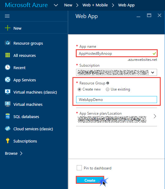 Select an app name for your Web app and select resource group (A resource group is a collection of resources, which shares the same lifecycle, permissions, policies) and click create.