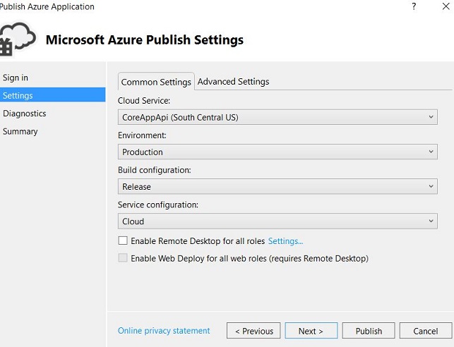 Now go to Setting- > create a new cloud service. In my case, I named it as CoreAppApi.