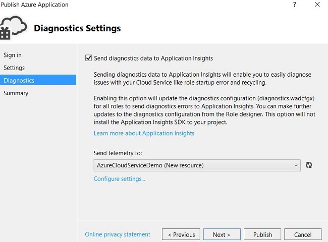 Right-click on the AzureCloudServiceDemo and select Publish. The "Publish Profile" wizard will be opened.