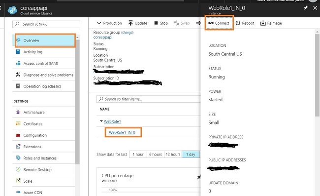 Login to the Azure portal, go to newly created Cloud service and go to Overview -> click on the web role. It will list you the configuration of that instance. Get the remote desktop connection and connect to the VM.