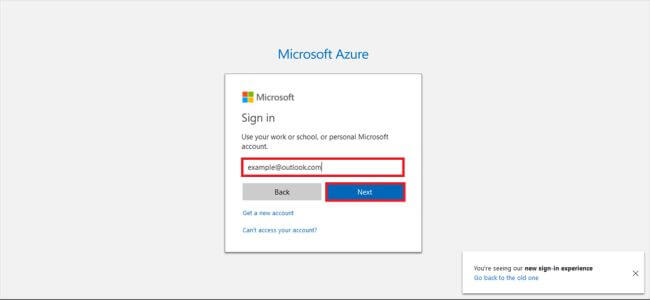 Sign-in into the Azure Portal by entering your email and the password, If you don't have any account press this