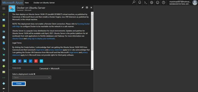 Read the Legal Terms and conditions then click the "Create" Button to invoke the Docker creation blade.