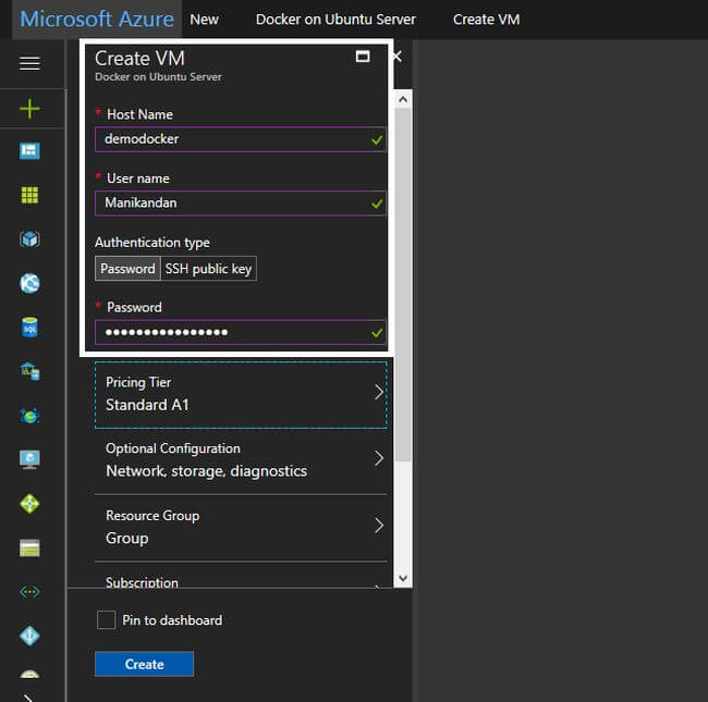 In the VM creation blade, give the required Host name, user Name and then choose & enter the password.