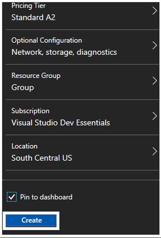 Leave the Optional configuration , Resourse group ,subscription and Location as the default one and then choose the docker to pin in the dashboard and then press " Create " to create the docker.