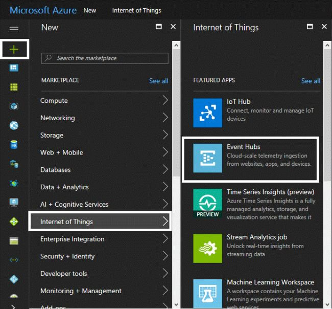 In the Azure Portal dashbord, click +(New) at the top left of the screen and select "Internet of Things", then click Event Hubs.