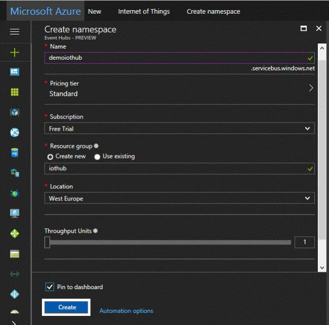 In the "Create namespace" blade, enter a namespace name. The system checks if the name is available or not. Then, choose the pricing tier (Standard) and press "Select".