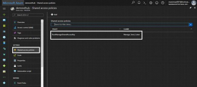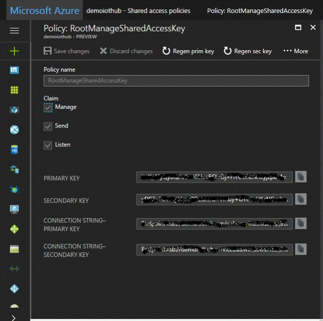 Press "Shared access policies" and then click "RootManageSharedAccessKey" in the namespace blade.