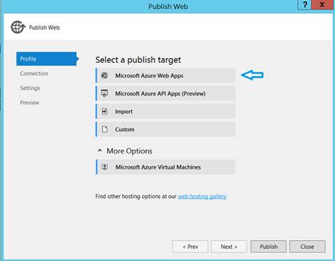 The ‘Publish Web’ window will pop up. Here, four sections/tabs are there which we can go through. The ‘Profile’ tab is initially activated. The remaining three tabs get enabled one by one after we complete the settings of the previous tab. Will go with ‘Microsoft Azure Web Apps’ as Publish Target, as I need to deploy web application into Azure Web Apps.