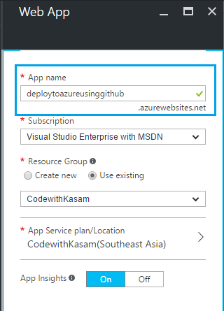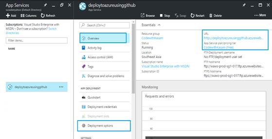 Now, Click => App Services => ' Web app name entered'. Here, we entered as 'deploytoazureusinggithub'.