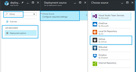 Select Deployment options => Choose Source (This will list all options available for linking as Source) => GitHub.