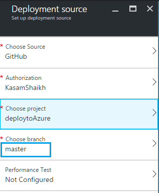 Now, it's time to select repository or project to be selected as file source. As seen below, all repositories are listed for selection. Here, we will select 'deploytoAzure'.