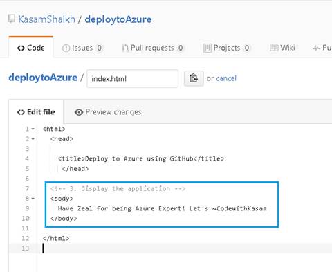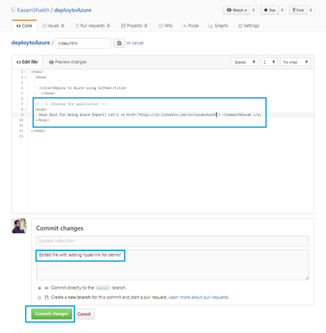 Let's do one more round of testing. Modify index.html from deploytoAzure repository, with adding hyperlink, as shown in the below image.