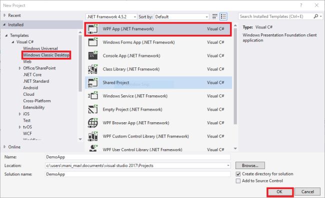 Navigate to "File-->New--> Project-->Windows Classic Desktop-->WPF App(.NET framework) and give the name for your solution, followed by a click on "OK".