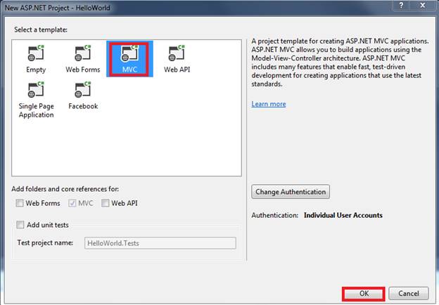 Provide a name for your MVC application and then click "OK". The following screen will be displayed.