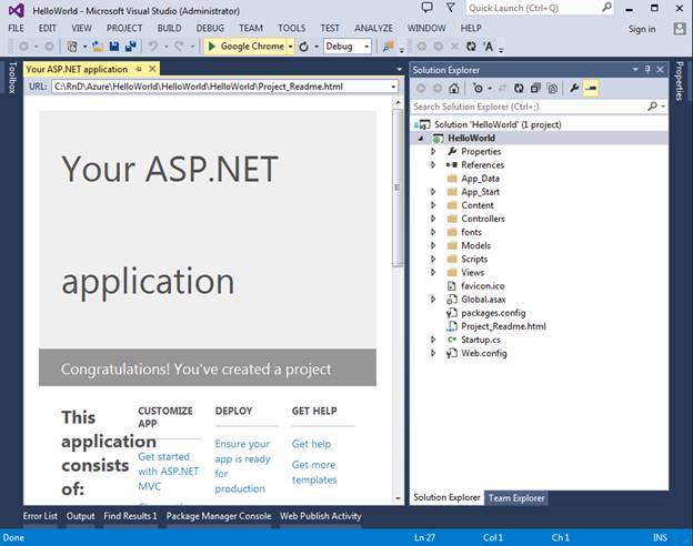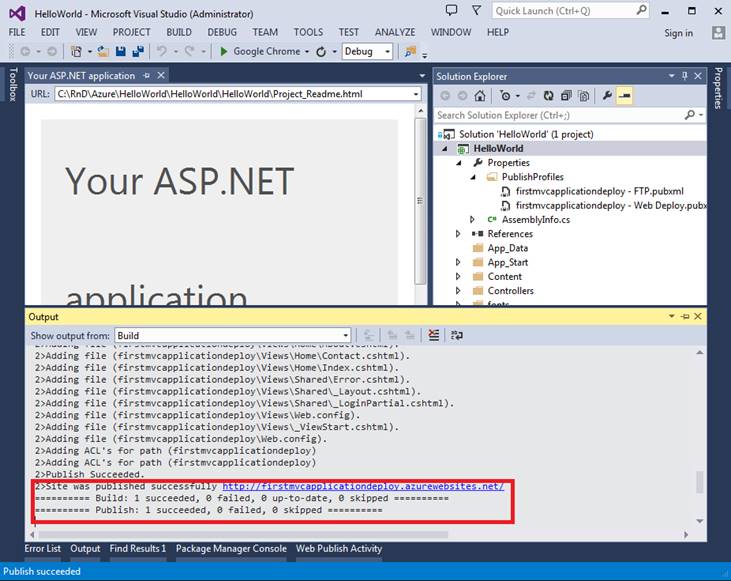 Now, click on “Publish” button. This will make Visual Studio compile your application in release mode and if everything is successful, VS will publish your application on Azure, using the publish profile we provided.