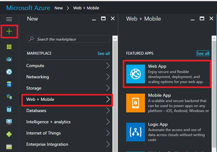 To setup MVC application in Azure, please click on “+”>>Web+Mobile>>Web App.