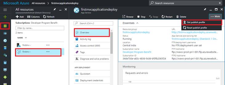 Once “firstmvcapplicationdeploy” is created, click on Resource Icon >> “firstmvcapplicationdeploy” >> Overview >> More and click on “Get publish profile”. This will download a published file named “firstmvcapplicationdeploy.PublishSettings” on your computer.