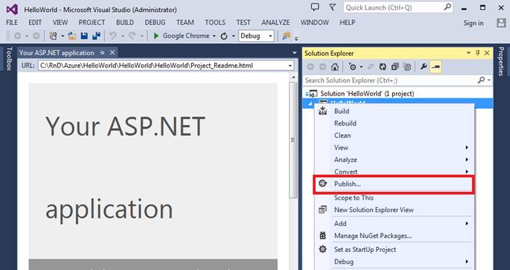 Now, back in our MVC application, right click on the "HelloWorld" project and click on "Publish" menu.