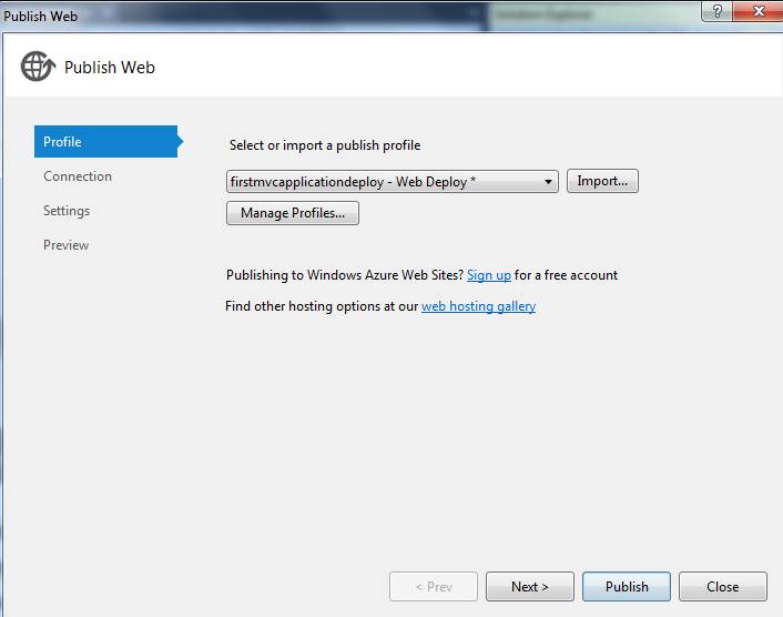 On the Publish screen, click on “Import” button and import “firstmvcapplicationdeploy.PublishSettings” file downloaded from the Azure portal.