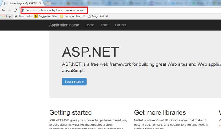 Once the MVC is on Azure, you can browse your application using firstmvcapplicationdeploy.azurewebsites.net URL. Every application on Azure is hosted as a sub-domain on azurewebsites.net.