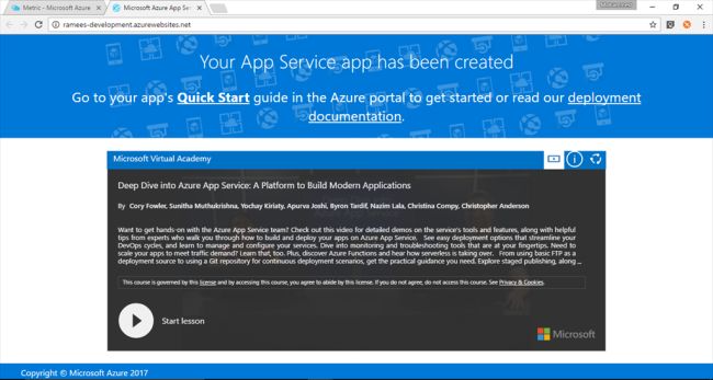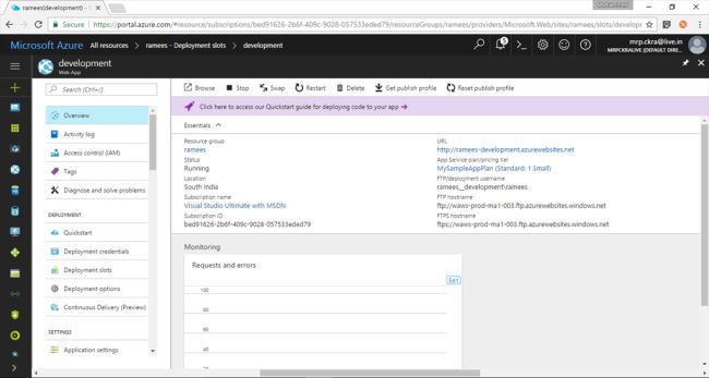 These slots are independent and do not talk to each other. Any changes that you make in one will not reflect in the other. Now, you can see that a new slot has been created and when you click on the new slot, you can get a new dashboard which looks like another website and has another URL with our domainname-development.azurewebsites.net.