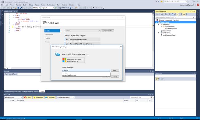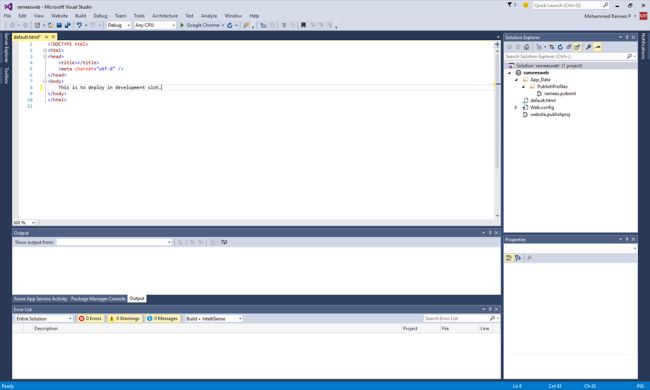 Now, let us see how we can publish to our new slot. I am loading a Visual Studio project that I made in the previous article. I made a small change as “This is to deploy in development slot” in the body tag and I am going to publish it.