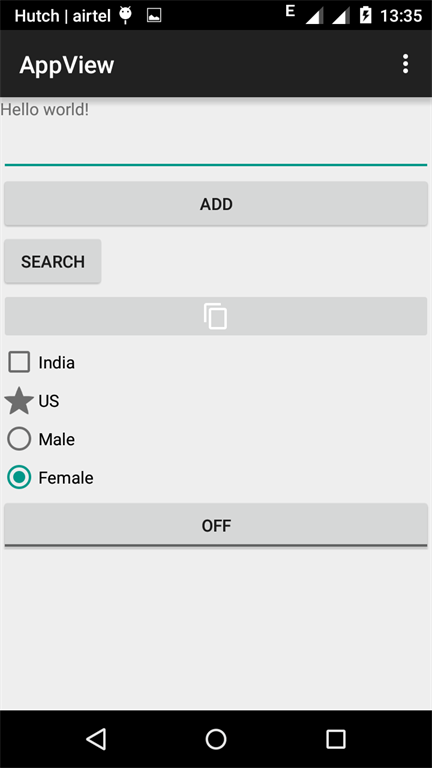 There is RadioGroup that encloses two RadioButtons. This is very important because radio buttons are usually used to present multiple options to the user for selection. When a RadioButton in a RadioGroup is selected, all the other RadioButtons are automatically unselected.