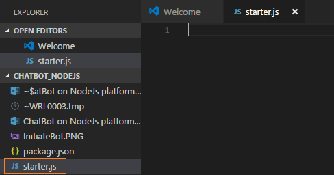 Now, open bot folder in Visual Studio code and create a JavaScript file in this folder with name starter.js and start coding in this file.