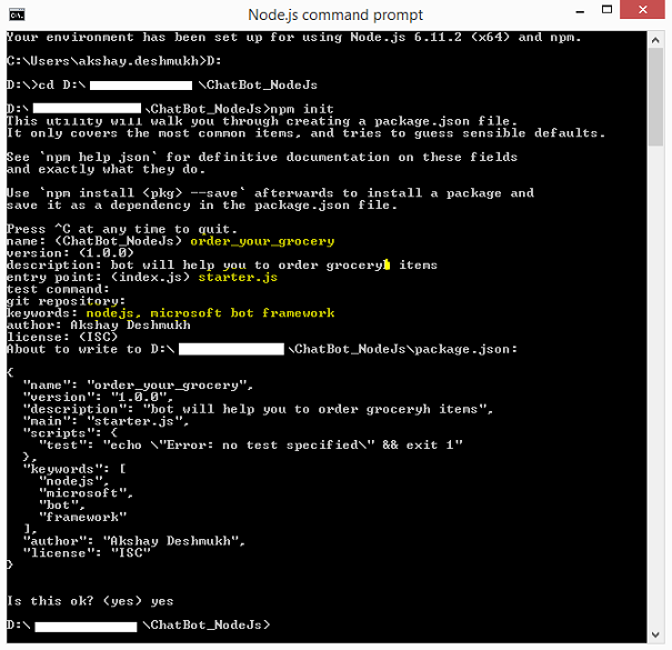 Here, I have entered the bot name as order_your_grocery. The starting js file for the application will be starter.js. After entering all details, it will print content for package.json and will ask for confirmation. After we confirm with yes, it will create the file and save it to the folder.