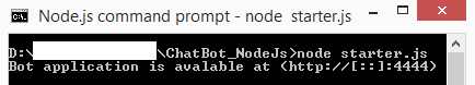 It’s time to test our bot application. Run the following command to start node.js bot app. It will run the application and show output mentioned in the callback function of server.listen.