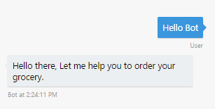 http://localhost:4444 /api/order_your_grocery to connect emulator with bot application. Keep App ID and App Password blank, click on Connect. Send "Hello" to bo; it will reply to you with welcome message we have written in