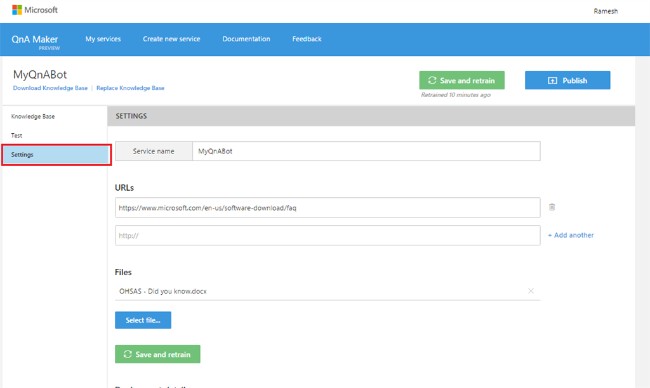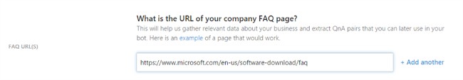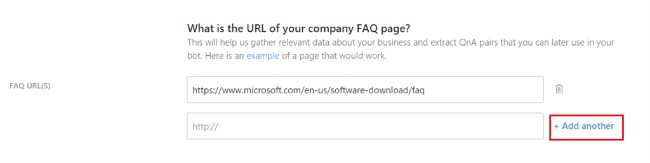 - We can add multiple FAQ site URLs to build QnA Bot. Give more relevant answers by clicking on “+Add another” link.