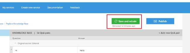 - After completing all the changes, we need to “Save and retrain” the Bot Service.