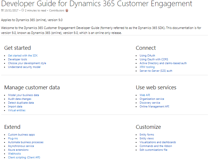 If you are waiting for Dynamics 365 version 9.0 download link. then you should read this article. Recently, Microsoft has made changes in the release of documentation for developers related to Dynamics 365 development which was referred to as SDK (Software Development Kit) earlier. Going forward, there won’t be any single SDK file to download; instead, the complete documentation can be accessed from