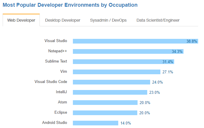 Another relative newcomer to the scene is Visual Studio Code, which makes a surprising rush to the top of the pile for the most favoured development environments for the Web developers. Its really great to see such an uptake on these new true cross platform technologies.