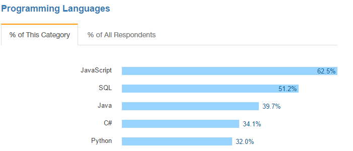 The spread of the languages is not surprising, and C# and Java are almost head to head. Python is increasingly becoming a popular language, being adopted in many areas for its ease of use, solid community support and accessibility to the new developers.