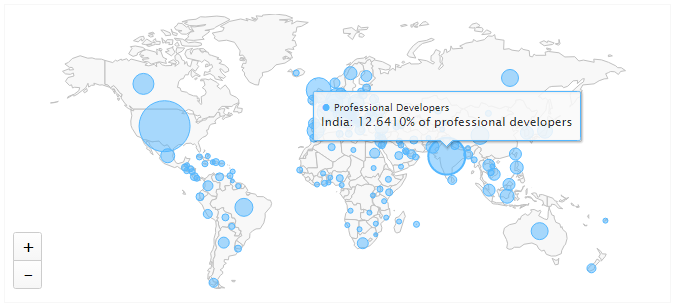 US developers make up the majority of professional developers, using the site with India; the second largest accounting for 12.64 percent. It's not surprising therefore to see Indian developers being the second most frequent visitors each month.