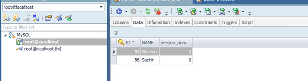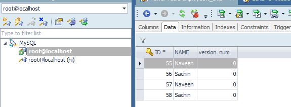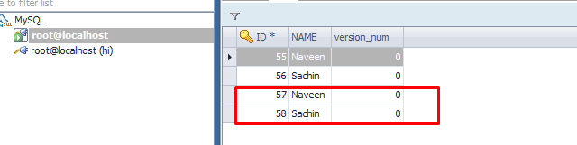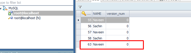 If you observe, a new record with id 63 has been created. This is from Outer Business Activity/DAO class EmployeeBABean.java. As the inner BA method has thrown some exception, its data has not been committed to the database. But, the outer BA method is propagated with REQUIRED_NEW, so its data is persisted to database.