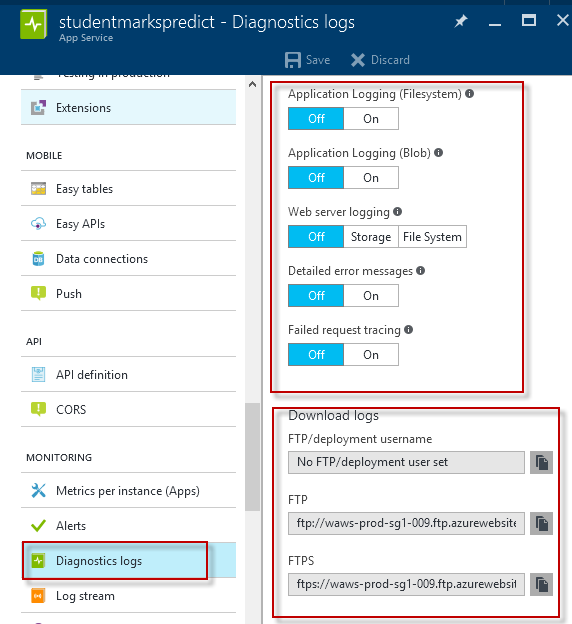 Diagnostic information is stored to the Web app file system, which can be accessed directly, using File Transfer Protocol. It can also be downloaded as a zip file, using Azure PowerShell or Azure Command-Line Interface.