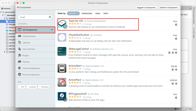 Now, select All Components. Search Toast after each complete. Choose Toast for iOS.
