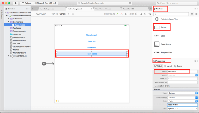 Now, you need to align the button, using constraints. Go to Properties Window, select the button and give a name (Ex:btnNotice).