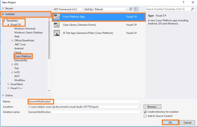 After opening the New Project, select Installed-->Templates-->Visual C#-->Cross-Platform-->choose Cross Platform App. Now, give your Xamarin from app; a name (Ex:sample) and give the path of your project. Afterwards, click OK.