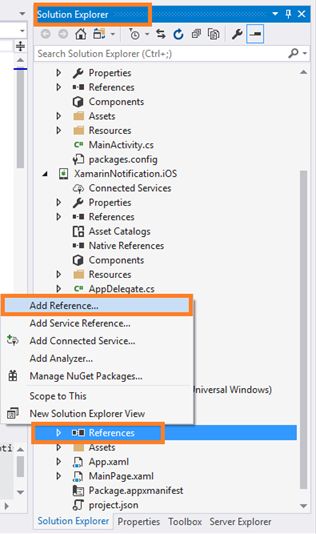 Now, go to Solution Explorer. In Solution Explorer, get all the files and source in your project. You can add Universal Windows Platform (UWP). In Reference, go to Solution Explorer-->Your Project-->UWP-->Reference-->Right Click --> Select Add reference.