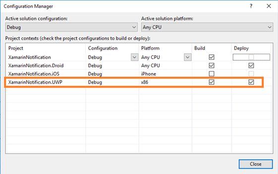 Now, you can run your app. Go to the Debug configuration Manager. Choose platform, check build and deploy option. Afterwards, click close.