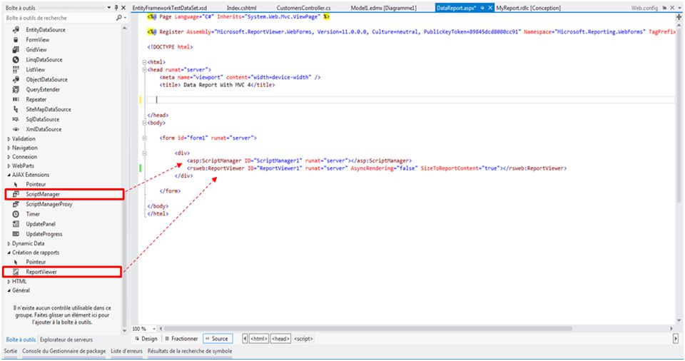 You will add Report Viewer and Script Manager Controls from ToolBoxpanel as shown below.