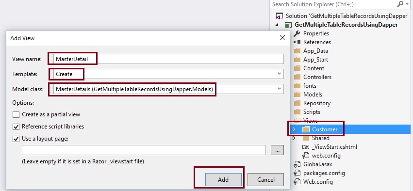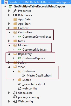 Now create Repository folder and Add CustomerRepo.cs class for database related operations, Now create methods in CustomerRepo.cs to get the multiple table data from stored procedure with the help of Dapper ORM as in the following code snippet: