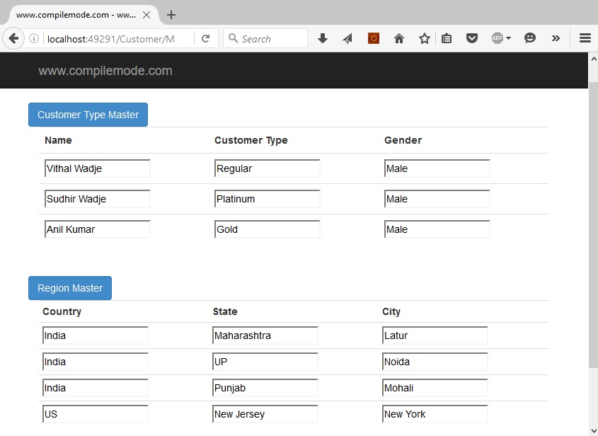 Now modify the default code in CustomerController.cs class file to bind multiple HTML tables in single view from strongly typed complex model class with list of records, After modifying code will look like as follows,