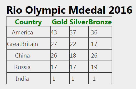 In below XSLT code, it creates a table and it searches country in XML content; then display name, no of medals in Gold, Silver, Bronze in rows based on countries.