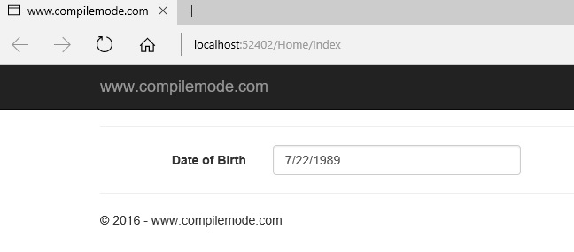 Now run the application the Index view appears as in the following screenshots. The Calendar UI differs as per browser.