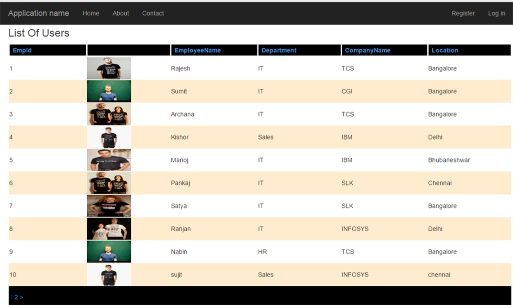 - li.Add(new Employees { EmpId = 10, Dept = "Sales", EmpName = "sujit", Location = "chennai", CompanyName = "INFOSYS", ImageUrl = "~/IMAGES/3.jpg" });